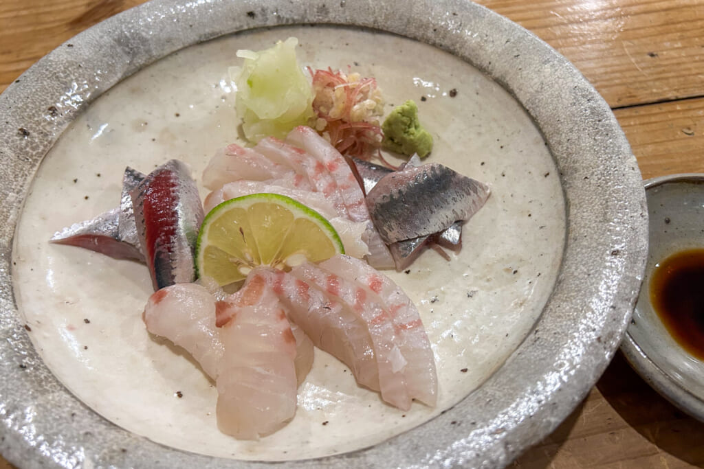 鯛、ホタテ、鰯、刺身の盛り合わせ