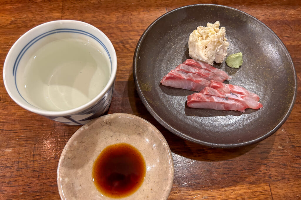 なんといっても日本酒がね、種類は多くないけど安くで飲める。この間も一の蔵が1合600円だったし、最近は僕の大好物山形の大山十水(800円)を入れてくれててね、これがいいんです。純米酒は正1合600円から。もちろん焼酎もいい。銘柄は多くないけど、鹿児島の普通のおじさんが普通に晩酌する銘柄を置いている。ビールは生ビールも瓶ビールもハートランド。
